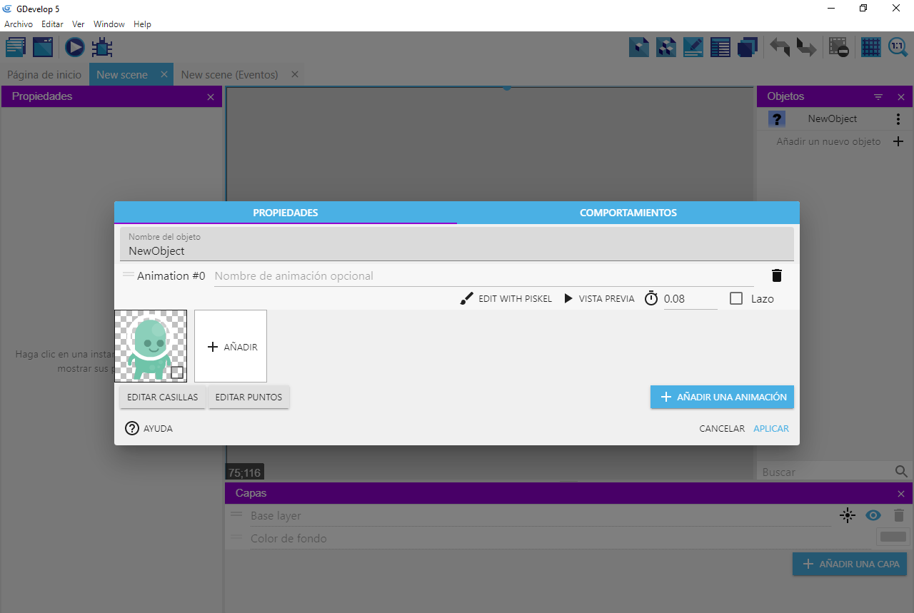 Diferentes tipos de objetos proporcionan características específicas. Para la mayoría de nuestros objetos, utilizaremos los objetos Sprite, que son objetos animados que se pueden usar para muchos elementos (jugador, plataformas, enemigos, elementos ...).