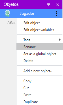Para que sea más fácil referirse a nuestro objeto, asígnele un nombre en lugar de usar el nombre predeterminado. Haga clic derecho en él (o haga clic en el ícono ⋯) y elija renombrar. Luego puede escribir "Jugador" y hacer clic en cualquier lugar de la pantalla o presionar la tecla Intro para cambiar el nombre del objeto.