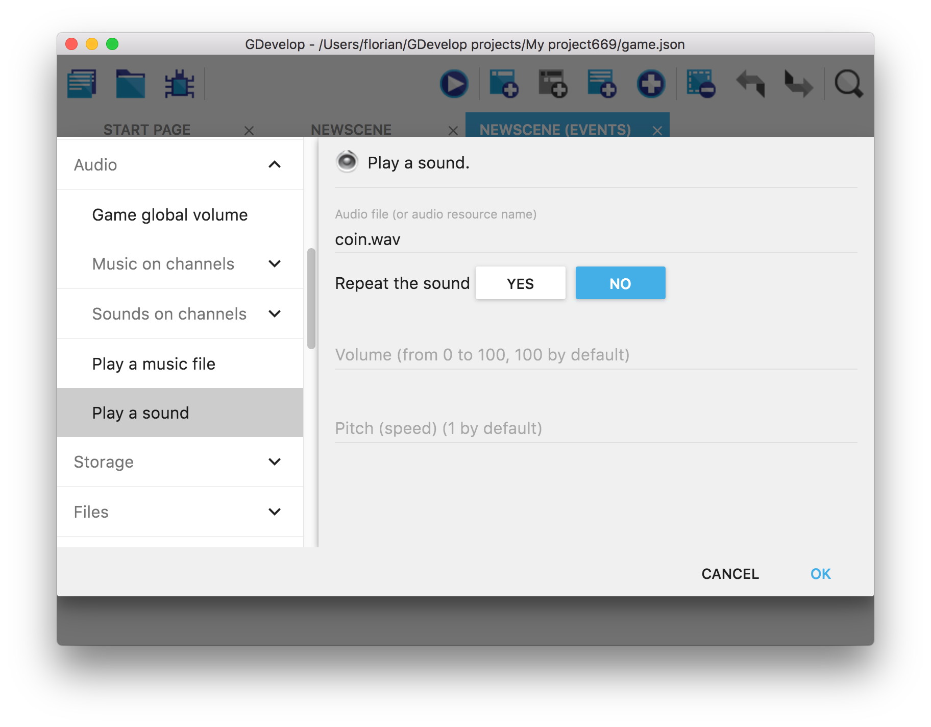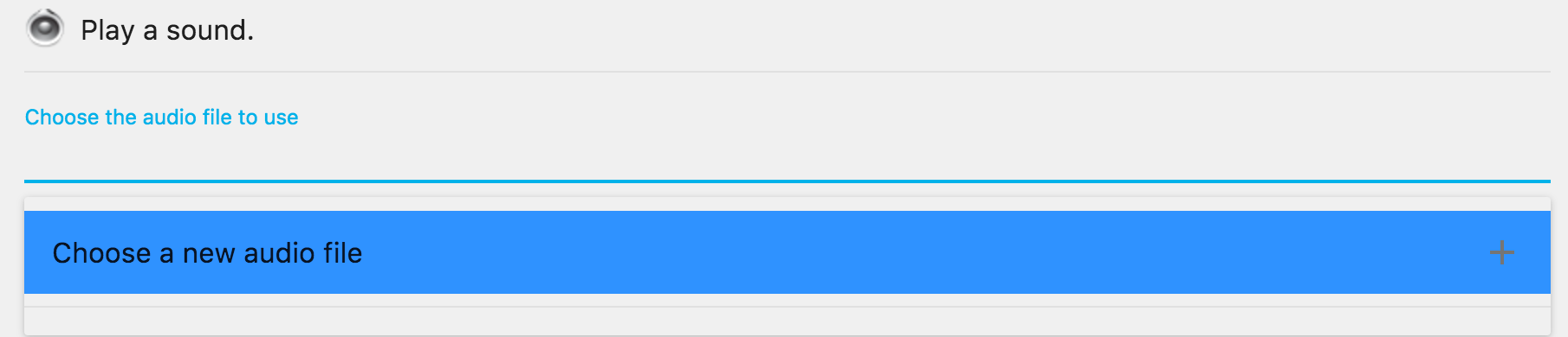 Hay un montón de parámetros disponibles para reproducir un sonido. El primero y más importante es el archivo de sonido a reproducir. Haga clic en el campo y luego en "Elegir un nuevo archivo de audio".