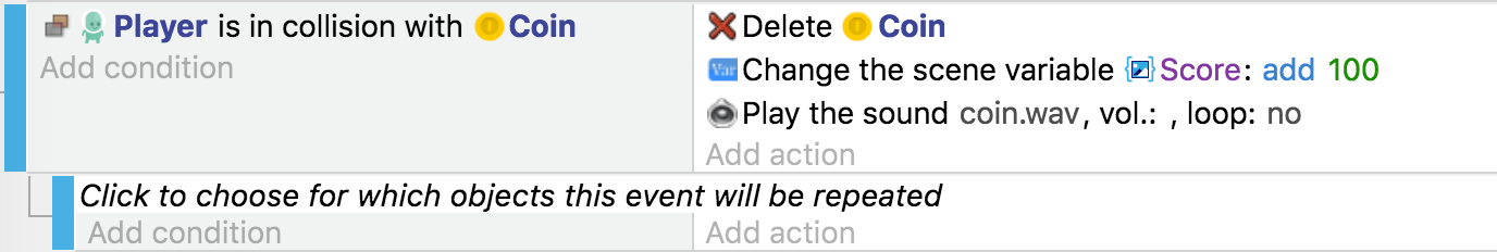 Es posible que haya notado que si recolecta dos monedas al mismo tiempo (por ejemplo, si dos monedas se superponen), el puntaje solo aumenta una vez. Por ejemplo, si cada moneda vale 100 puntos y acumulas 2 monedas, la puntuación solo aumentará a 100 en lugar de 200. La solución para esto es fácil y es algo que aún no hemos visto: vamos a utilizar un evento llamado para cada objeto. Lo que haremos es decirle al motor que por cada moneda que se recolectó, agregue 100 a la puntuación.