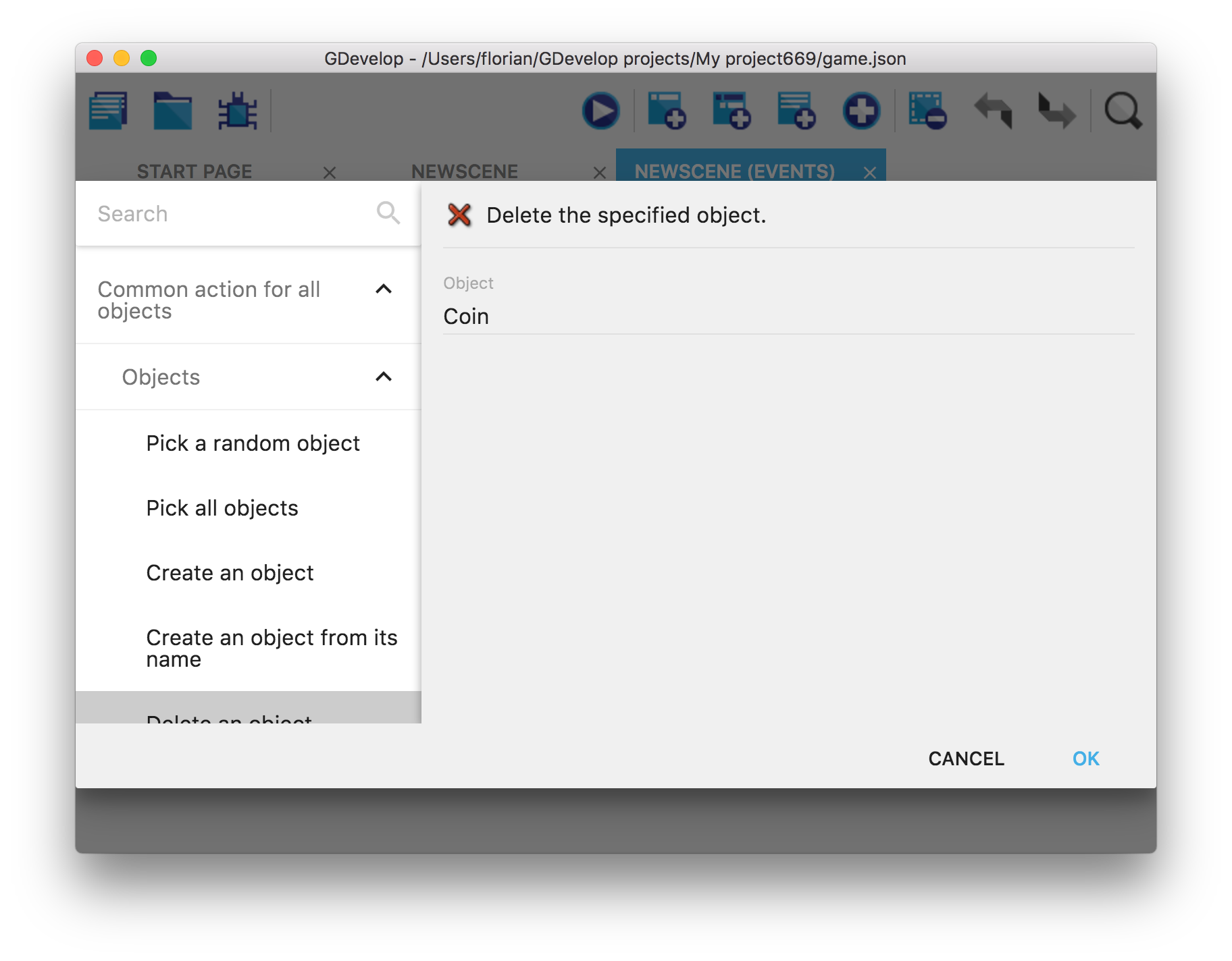 A continuación, puede agregar una acción que eliminará la moneda. La acción solo utilizará los objetos de Monedas que se hayan recogido en la primera condición, por lo que solo se eliminará la moneda que chocó con el jugador.