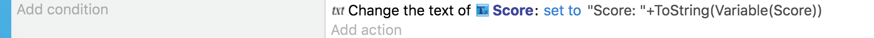 Finalmente, podemos agregar esta expresión después de un texto estático usando el operador "+":" Score: "+ ToString (Variable (Score))" (note las comillas dobles que rodean el texto).
