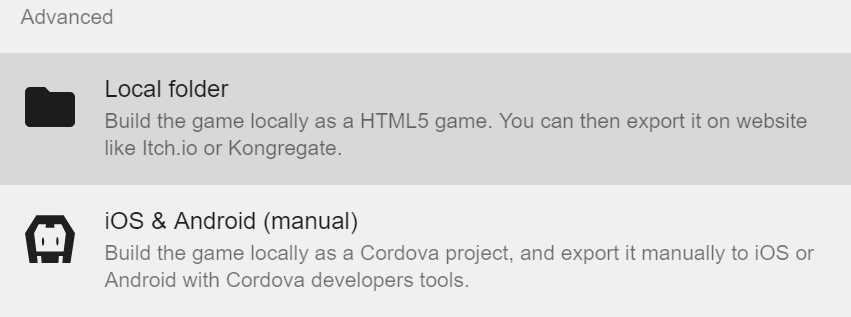 Une boite de dialogue apparait et permet de choisir pour quelle plateforme exporter le jeu. Ce tutoriel se concentre sur l'export HTML5 qui permet de jouer directement depuis un navigateur. Défilez vers le bas si nécessaire jusqu'à voir apparaitre Advanced et choisissez Dossier local.