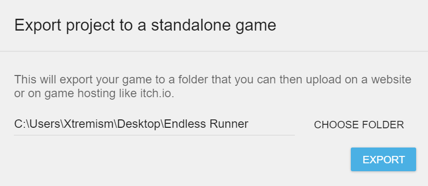 Préparer un jeu pour itch.io est très simple. La seule chose à faire est d'archiver le dossier exporté dans un fichier ZIP. Il faut tout de même bien veiller à ce que le fichier "index.html" soit dans le dossier archivé et non dans un sous-dossier.