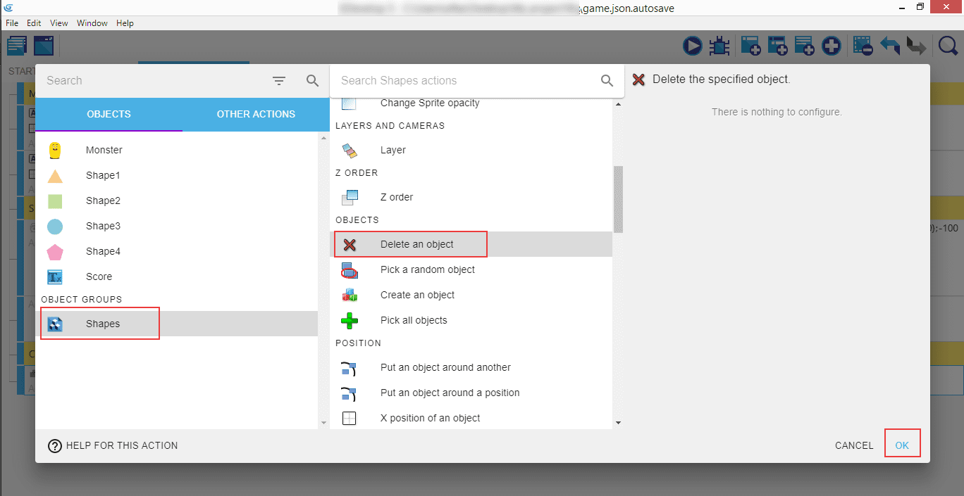 Activez Shapes, recherchez et activez Delete an object (Supprimer un objet) puis cliquez OK: