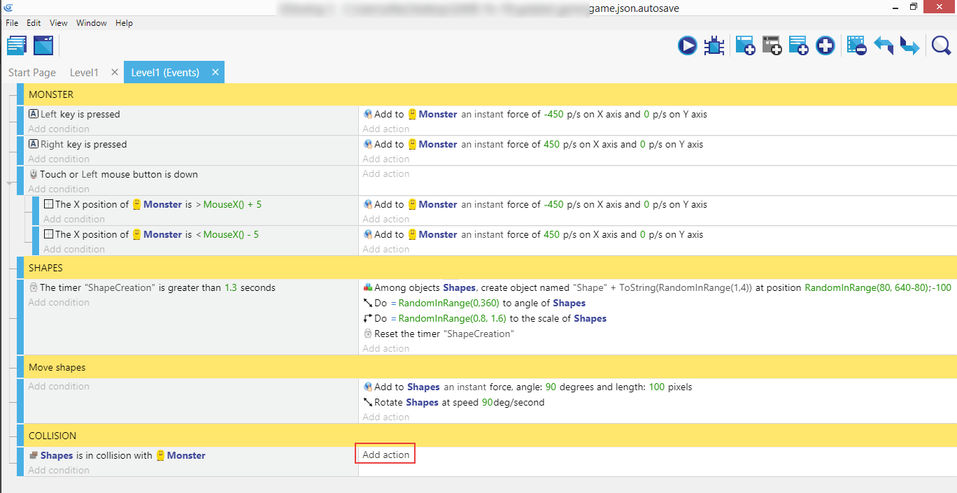 Comme toujours, assurez-vous que Shapes soit sélectionné, puis recherchez Collision (qui testera la collision entre deux objets). Dans le panneau de droite, entrez Monster et cliquez sur OK.