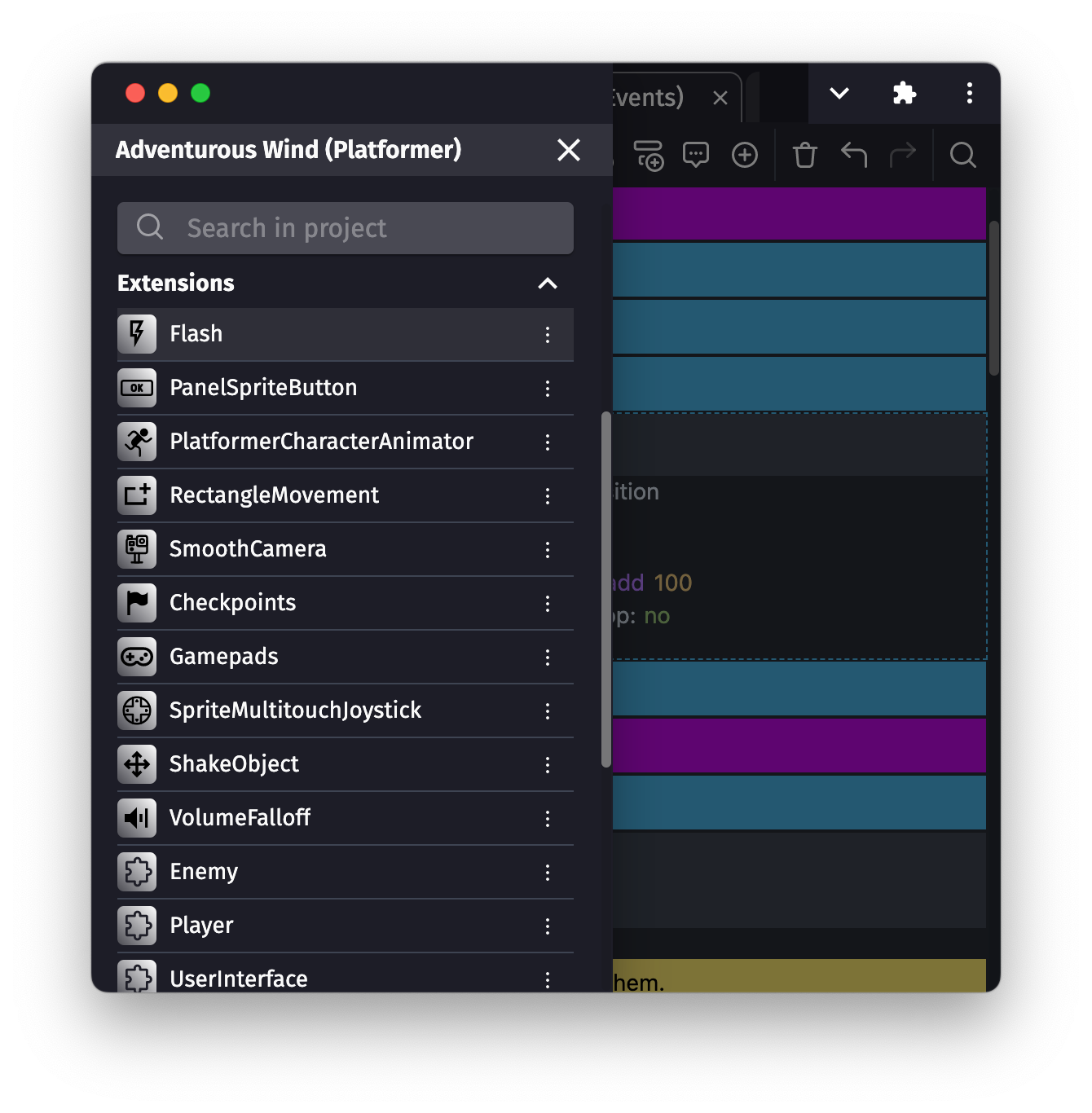 It's possible to easily create new extensions, using the same events that you're using in the scenes. It's a powerful feature that allows you to organize your game and extend your objects.