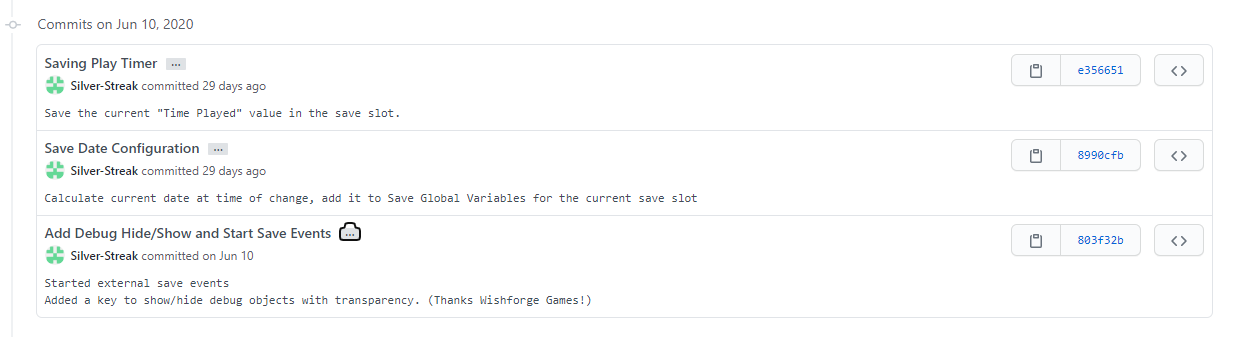 3. Going forward, new branches should be created as the game project moves on to each new feature or bugfix. Because Github allows for restoring the game code only to different commits, commits to branches should be completed frequently. Here are some examples of how frequently commits are completed in just one day, along with descriptions to easily identify what is changed: