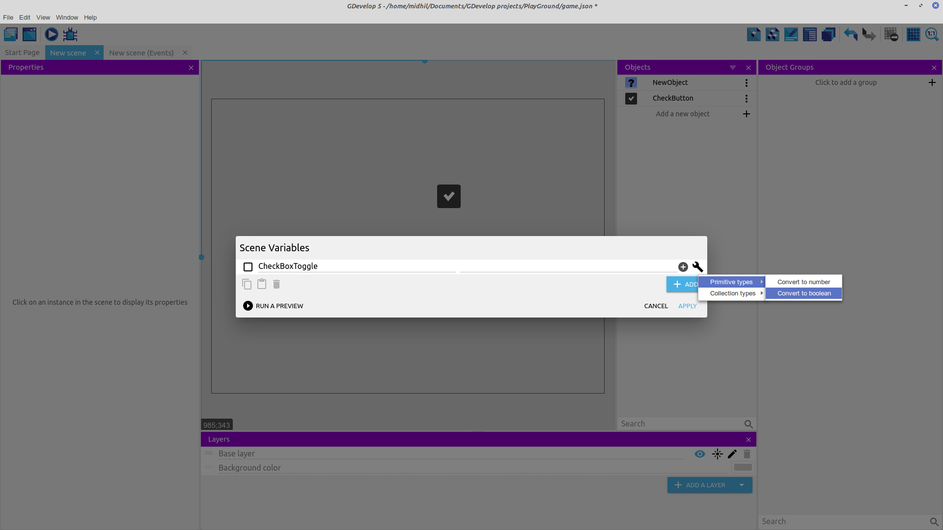 子変数が存在しない場合は、GDevelop がそれを自動的に作成します。