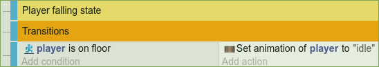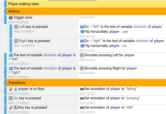 アニメーションに頼らなくても、「状態」専用の シーン変数でプレイヤーの状態を管理することもできます。これはより上級のテクニックですが、自由度は増します。しかしここで説明している、ロジックとそれに対応するアニメーションをセットにするアプローチには、分かりやすさとイベントシートのシンプルさという利点があります。さらに、現在のアニメーション/状態のフレームをチェックして、アニメーション内の特定フレームに差し掛かったときに別のロジックをトリガーするというような高度な分岐処理もできます。