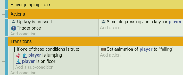 もう見当がつくと思いますが、最初にやることは、この状態に入ったら一度だけジャンプアクションをトリガーすることです。ジャンプするフォースは黙っていてもかかるので、一度ジャンプしたらあとはもうその件について考える必要はありません。毎度のことですが、最後に必要なのは現在の状態から抜けるための条件設定です。今回の場合は、プレイヤーが「ジャンプ中ではない」ことと「落下中ではない(地面の上にいる)」ことをチェックします。どちらかに当てはまっていれば、「落下」状態に移行します。