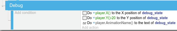 ゲームプレイ中にプレイヤーが今どの状態にあるのかを知るために、テキストオブジェクトを作成して「デバッグ状態」という名前をつけます。これをメインシーンに追加して、次のようなアクションを作成します(条件は無しでよいです)。これでプレイヤーの頭上に現在の状態が表示されるようになり、何か問題が発生したときにはいつでも、どの状態を調べればいいのかが一目でわかるでしょう。
