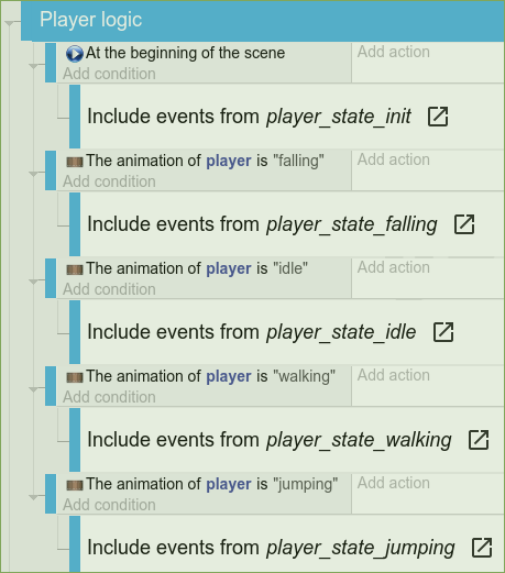 イベントエディターに切り替え(main シーン)、プロジェクトマネージャーから外部イベント「プレイヤー状態初期化」、「プレイヤー状態落下」、「プレイヤー状態待機」、「プレイヤー状態歩行」、「プレイヤー状態ジャンプ」を作成します。右側のツールバーからイベント作成用のドロップダウンメニューを開き([イベントを選択して追加]ボタン)、main シーンのイベントに新しいイベントグループを作成します。「プレイヤーのロジック」と名前をつけます。シーンが始まった条件をイベントに追加します。サブイベントを追加して、[他を追加](ツールバーまたは右クリックメニュー)から「プレイヤー状態初期化」外部イベントへのリンクを作成します。他のプレイヤー状態についても、同様の手順を繰り返してください。