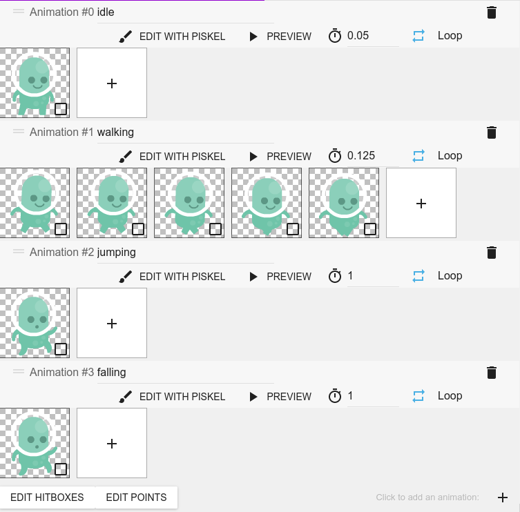 アニメーションに頼らなくても、「状態」専用の シーン変数でプレイヤーの状態を管理することもできます。これはより上級のテクニックですが、自由度は増します。しかしここで説明している、ロジックとそれに対応するアニメーションをセットにするアプローチには、分かりやすさとイベントシートのシンプルさという利点があります。さらに、現在のアニメーション/状態のフレームをチェックして、アニメーション内の特定フレームに差し掛かったときに別のロジックをトリガーするというような高度な分岐処理もできます。