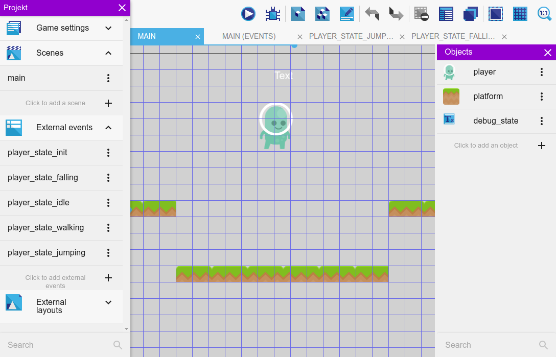 イベントエディターに切り替え(main シーン)、プロジェクトマネージャーから外部イベント「プレイヤー状態初期化」、「プレイヤー状態落下」、「プレイヤー状態待機」、「プレイヤー状態歩行」、「プレイヤー状態ジャンプ」を作成します。右側のツールバーからイベント作成用のドロップダウンメニューを開き([イベントを選択して追加]ボタン)、main シーンのイベントに新しいイベントグループを作成します。「プレイヤーのロジック」と名前をつけます。シーンが始まった条件をイベントに追加します。サブイベントを追加して、[他を追加](ツールバーまたは右クリックメニュー)から「プレイヤー状態初期化」外部イベントへのリンクを作成します。他のプレイヤー状態についても、同様の手順を繰り返してください。